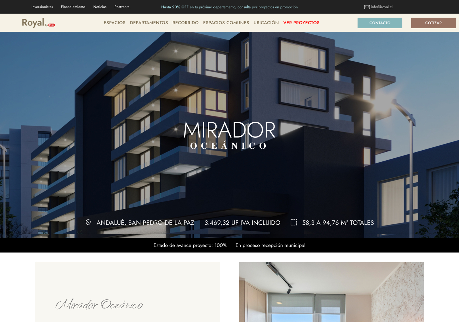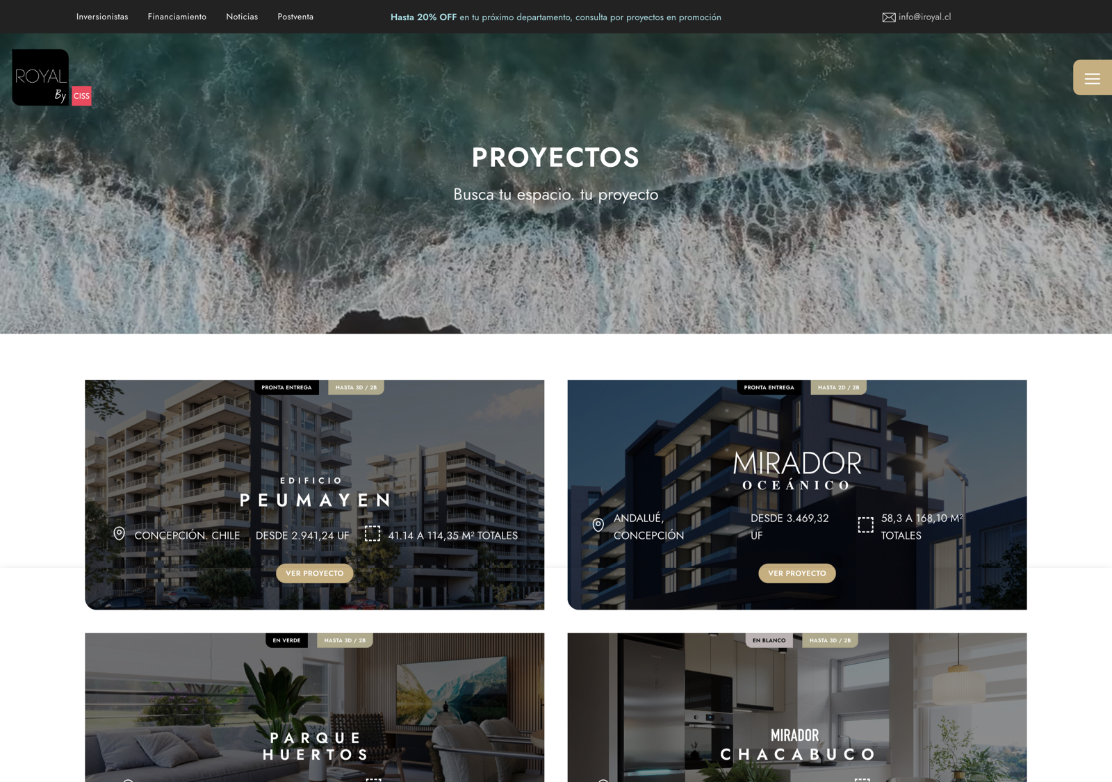 iRoyal.cl surge como la propuesta digital premium de CISS, inmobiliaria principal con trayectoria en el mercado. El portal reúne proyectos de mayor gama en distintas etapas —desde entrega inmediata hasta en verde y en blanco— con información clara y un diseño elegante que transmite confianza. Diseñado para inversionistas y clientes de perfil más alto, iRoyal ofrece secciones dedicadas a inversión, financiamiento y postventa, consolidándose como el espacio digital de referencia en Concepción y San Pedro de la Paz para quienes buscan seguridad, exclusividad y estilo de vida superior.